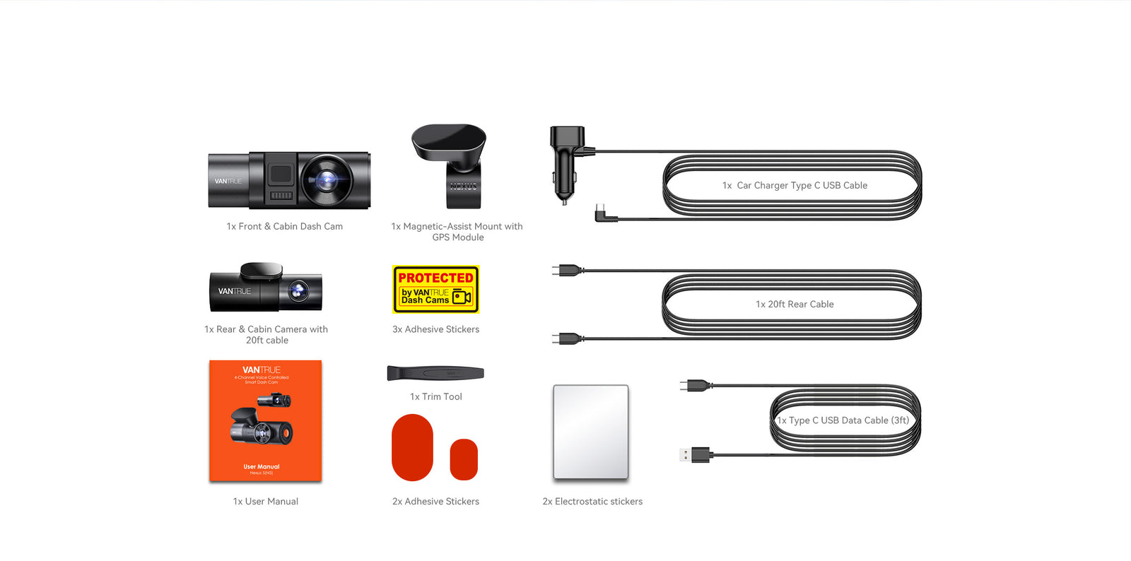 بالإضافة إلى كاميرات dash، تقدم Vantrue أيضًا ملحقات مثل حوامل الالتصاق، ومجموعات الأسلاك لتوصيل الطاقة المباشر، وبطاقات الذاكرة لتخزين لقطات الفيديو.