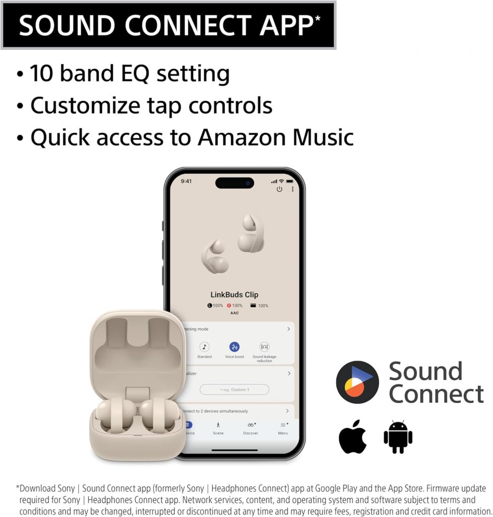 الميزة الثانية هيا أن السماعات تدعم كذلك تقنية 360 Reality Audio، وهي ميزة موجهة لعشاق الصوت المحيطي، لكن الاستفادة منها تتطلب محتوى متوافقًا ومن خلال التطبيق الرسمي. وبالحديث عن التطبيق، فإن LinkBuds Clip تعتمد على تطبيق Sony Sound Connect المتوفر على أندرويد وiOS، وهو مركز التحكم الكامل في التجربة، من خلاله يمكن إدارة أوضاع الاستماع، تخصيص إعدادات المعادل الصوتي، وضبط عناصر التحكم السريعة.