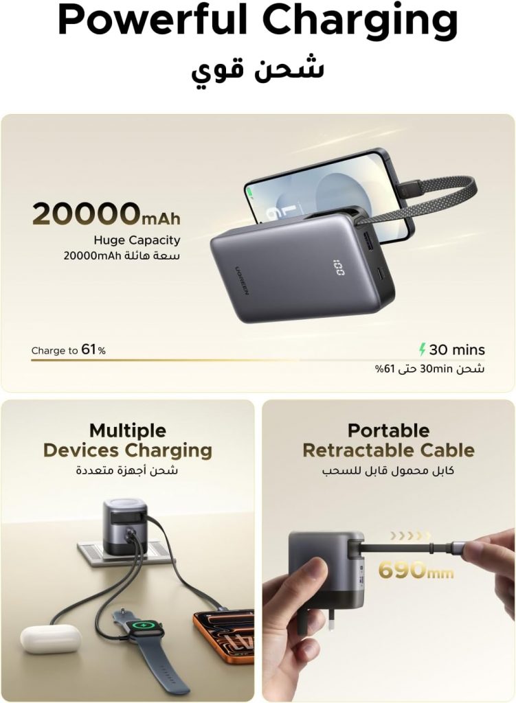 باور بانك UGREEN Nexode بسعة 20000mAh يقدم تجربة متقدمة في مجال الطاقة المحمولة من خلال الجمع بين السعة الكبيرة والتقنيات الحديثة والتصميم العملي. هذا الباور بانك لا يشبه أي جهاز عادي، فهو يأتي بكابل USB-C مدمج قابل للسحب يمكن سحبه بسهولة عند الحاجة ثم إعادته إلى موضعه، مما يجعل من عملية الشحن أمرًا منظمًا وخاليًا من الأسلاك المتشابكة. سعة البطارية العالية تبلغ 20000 ميلي أمبير، وهي كافية لإعادة شحن الهواتف الذكية عدة مرات، وأجهزة اللوحية، وحتى تقديم شحن مؤقت لأجهزة الكمبيوتر المحمولة الصغيرة أو الأجهزة التي تدعم شحن USB-C بقدرة عالية. قوة الخرج الإجمالية تصل إلى 165 واط، مما يعني أنك تستطيع توصيل أكثر من جهاز في الوقت نفسه دون التضحية بسرعة الشحن، وفي بعض الاستخدامات يمكن لهذا الباور بانك شحن جهاز مثل MacBook Air إلى نسبة جيدة من الشحن في وقت قصير نسبيًا عند توصيل كابل PD المناسب. يتميز الجهاز أيضًا بأنه يدعم إعادة الشحن بسرعة بفضل مدخل USB-C الذي يمكنه استيعاب 100 واط من الطاقة، مما يسمح بإعادة شحن الباور بانك نفسه من فارغ إلى كامل خلال وقت معقول. وجود شاشة TFT تعرض معلومات الطاقة المتبقية وقوة خرج الشحن يجعل تجربة الاستخدام أكثر وعيًا للمستخدم، خصوصًا أثناء التنقل أو أثناء الاجتماعات أو السفر الطويل. بشكل عام، UGREEN Nexode Power Bank هو حل ممتاز للطاقة المتنقلة يجمع بين الأداء، السعة الكبيرة، والتصميم العملي الذي يلائم حياتنا اليومية.