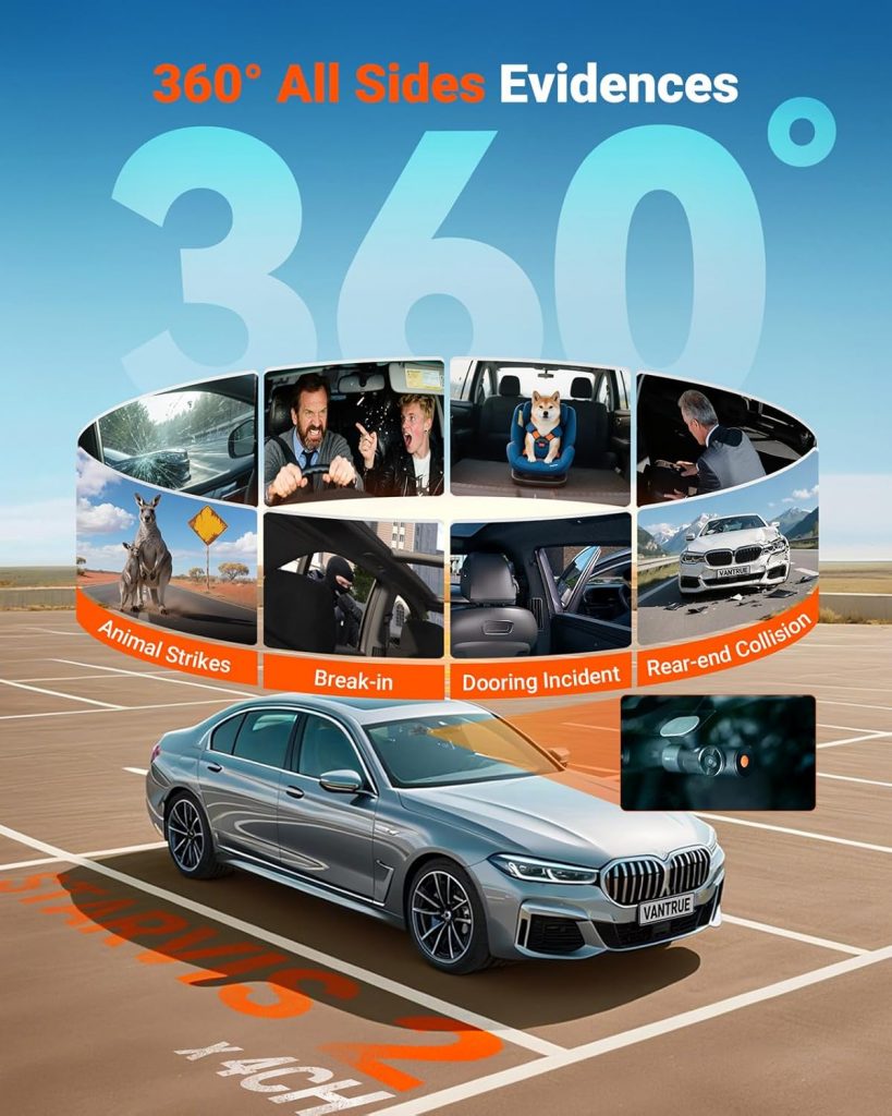 من الناحية العملية، نجحت Vantrue في توزيع العدسات الأربع بشكل ذكي داخل الجسم، بحيث تغطي الكاميرات الأمامية والداخلية والخلفية زوايا واسعة تصل إلى 158 درجة تقريباً، وهو ما يضمن توثيق المشاهد داخل وخارج المركبة بأقل قدر من النقاط العمياء. كما دعمت الشركة الكاميرات الداخلية بمصابيح IR LED لالتقاط صور واضحة في الظلام، في حين زوّدت العدسة الأمامية والخلفية بمستشعرات Sony Starvis 2 لتعزيز الأداء الليلي.