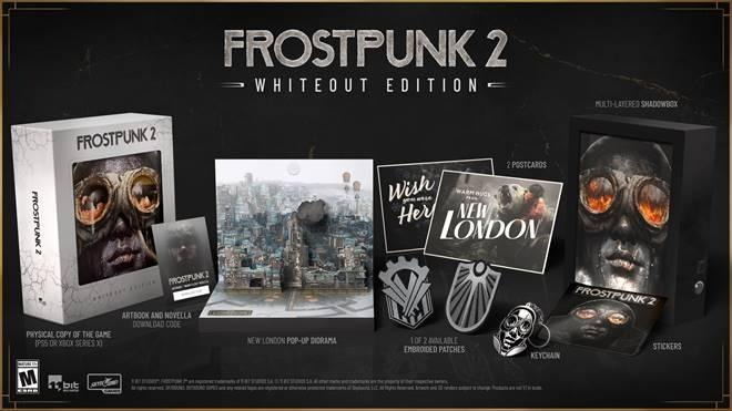 - نسخة Frostpunk 2: Whiteout Edition (لـ PS5 أو Xbox، بسعر 99.99 دولار / 94.99 جنيه إسترليني / 99.99 يورو) تتضمن جميع محتويات نسخة Icebreaker داخل صندوق متعدد الطبقات مزود بإضاءة LED مدمجة وفن أيقوني. كما تشمل ترقية Deluxe Edition التي تمنح الوصول إلى ثلاثة محتويات إضافية جديدة وقادمة، إلى جانب تذكارات مادية: سلسلة مفاتيح فاخرة من المعدن والمينا، بطاقتان بريديتان فنيتان فاخرتان لمدينة نيو لندن، ملصقات مستوحاة من Frostpunk، وأحد رقعتين مطرّزتين لإحدى الفصائل – إما التكنوقراطيون المنضبطون أو Icebloods المتحمسون.