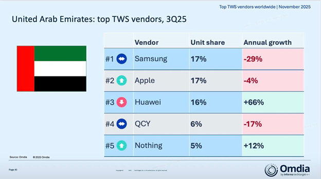 ويسر Nothing بعد إطلاق نظام التشغيل 4.0 الاحتفال بإنجازٍ كبير في الإمارات العربية المتحدة. فوفقاً لبيانات الربع الثالث من Omdia/Canalys، حصدت العلامة التجارية مكاناً لها بين أفضل 5 علامات تجارية لأجهزة TWS (الاستريو اللاسلكي الحقيقي)، متفوقةً على منافسيها العالميين في مجال الصوت. ويُبرز هذا الإنجاز طلب المنطقة المرتفع على المنتجات عالية الجودة والتصاميم المتميزة التي تُكمل أنماط الحياة العصرية.